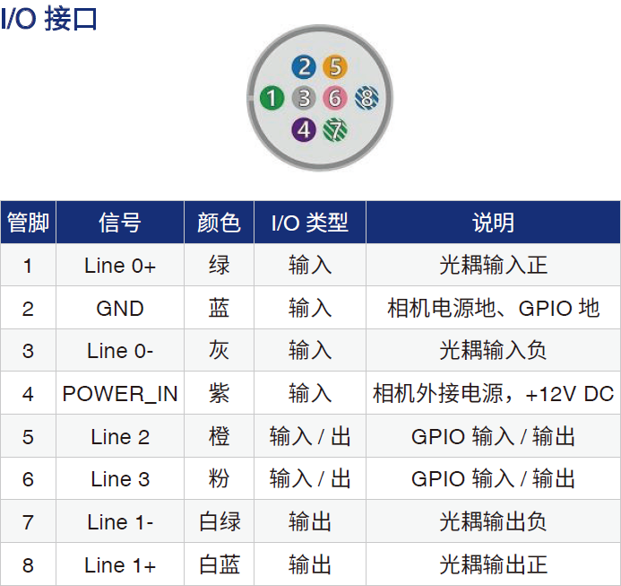 **华视/华动提供IO线有可能为第三方提供的高柔IO线,非官方的标准线缆,因此线序对应的颜色,与大恒官方的不相同,请以标示的线序为准,即Pin脚线序作为参考依据。