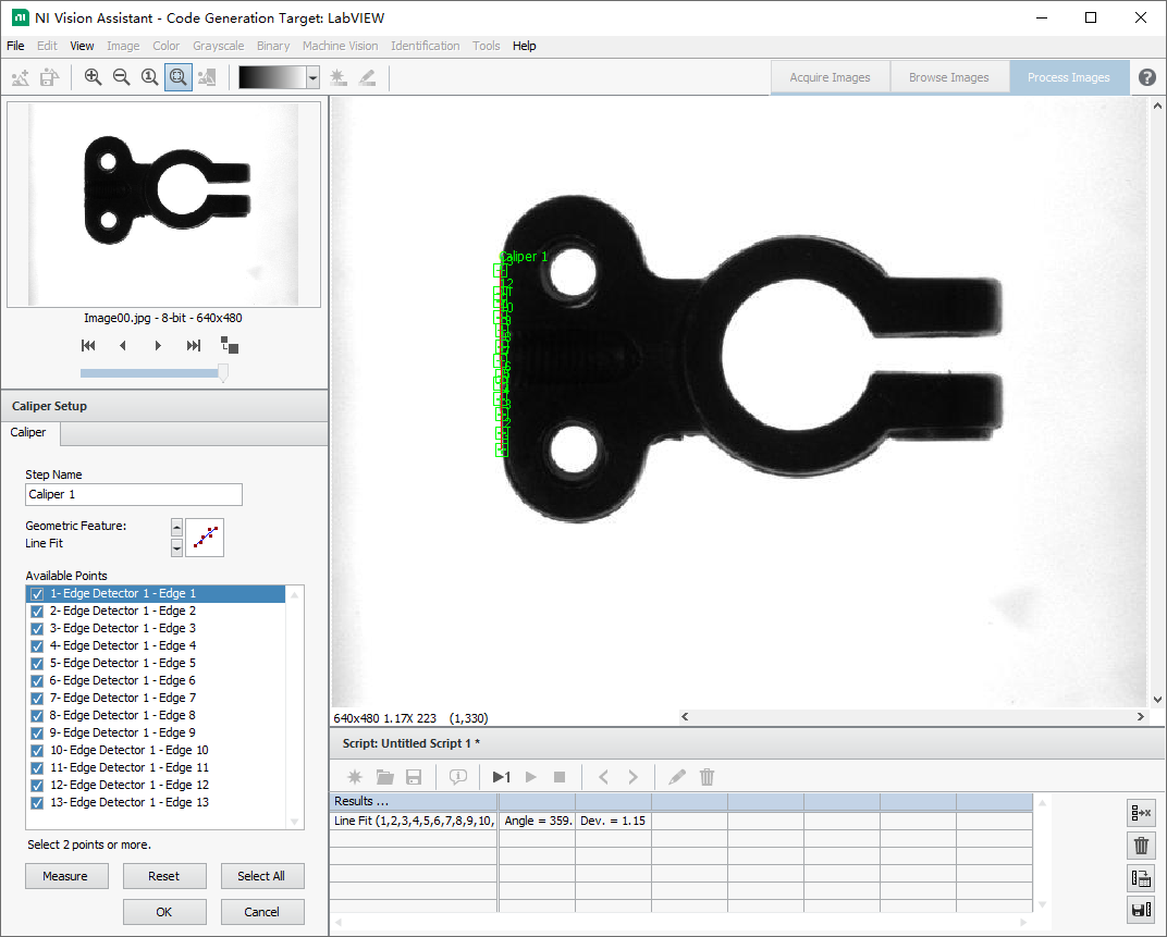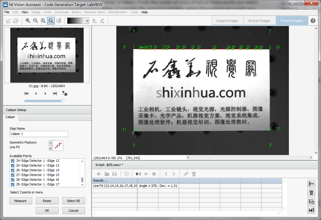 这里的直线拟合返回的结果,稍微显得简单了一些,拟合的直线并没有返回直线的起点和终点,仅仅返回了直线的角度和偏差。而在LabVIEW Vision的拟合线函数中,实际上是有返回线段结果的: