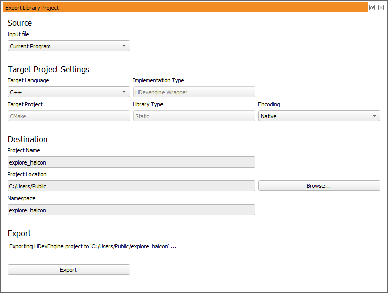 Shows the final location of the library project based on the settings in Destination. After specifying the project properties, click the button Export to generate the library project. If you export from HDevelop XL, you will obtain an XL variant of the library project.