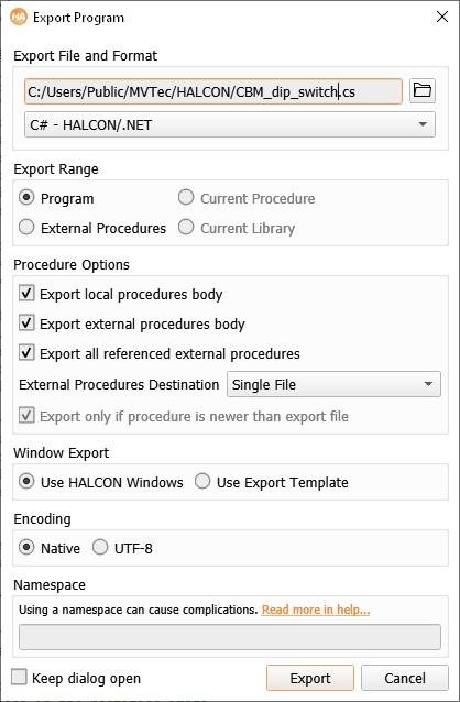 Use Export Template (HALCON/.NET only): Export as a project using the supplied project template.