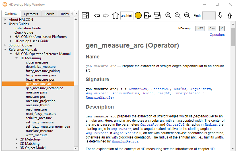 The help window provides access to HALCON's online documentation. The window is split into two areas: On the left, navigational panels are available as tab cards. They are described below. Please note that you can press the Up and Down keys in the navigational panels to select the previous and the next entry, respectively. This allows you to examine, for example, search results quickly. The main area displays the actual hypertext content. The size of the two parts of the help window can be adjusted by dragging the dividing line.