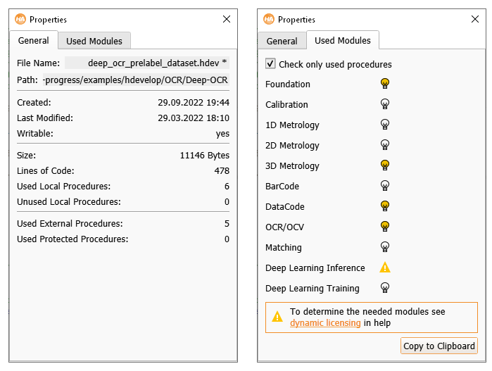 The tab card Used Modules lists the HALCON modules used by the current program. Modules marked with are used. Modules marked with are potentially in use by dynamic licensing. This window allows you to get an estimate of how many modules your application will need in a runtime license. Please refer to the Installation Guide for more information about modules, runtime licenses, and dynamic licensing. See figure 6.35 for the corresponding dialog of a 3D object processing example.