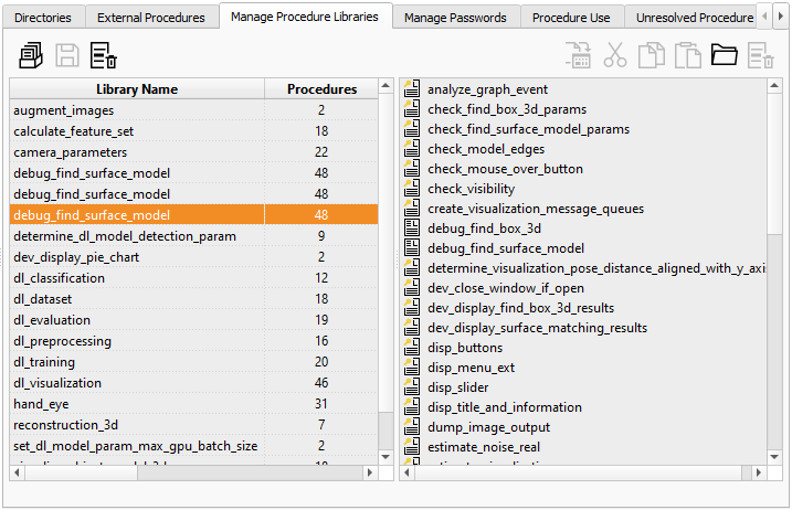 The table on the left lists all libraries, the number of contained procedures, and the path name to the library file. The special entry “Procedures” contains all local procedures and all external procedures that are not contained in a library.