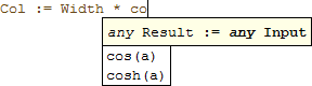 The first entry in this list is a suggestion that completes the full operator call up to the closing parentheses. Again, typing ahead updates the list of suggestions accordingly. The remaining entries are suggestions for the first parameter of the operator call.