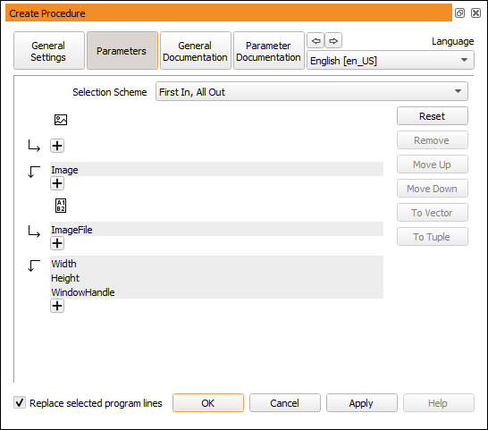 When creating a new procedure from selected program lines, HDevelop automatically determines suitable interface parameters for the procedure from the usage of the variables in the selected code. The combo box Selection Scheme determines the suggestion of the procedure parameters.
