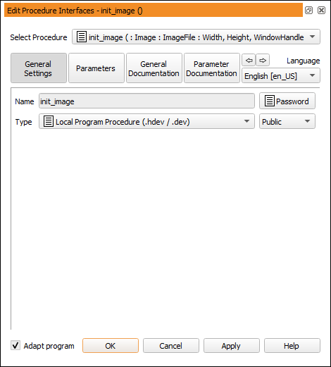 Using the upper buttons of this dialog, you can select the data associated with the current procedure: The button General Settings provides access to the procedure name, its type and its parameters.