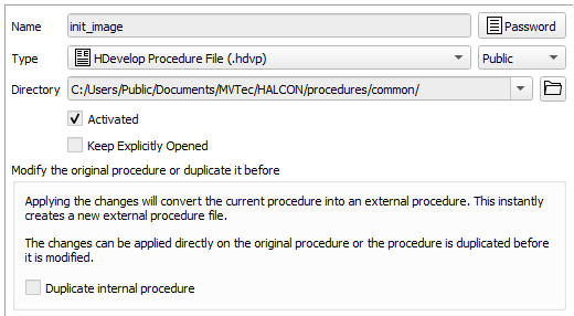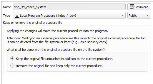 If the procedure type is changed to “external”, a new external procedure file will created in the specified directory. Changing the type “local” to “library” modifies the library file of the selected target library. Conversely, setting the type of a library procedure to “local” modifies the current program. In all these cases the option Duplicate internal procedure determines what happens with the original procedure.