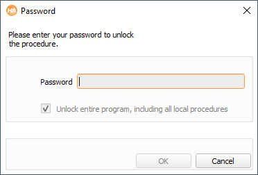 If you set up a password for the main procedure, you can optionally lock the entire program, and protect all local procedures with the same password. The same mechanism works for library procedures: You can either protect the library procedures individually, or protect the entire library at once (see section “”). If individual local procedures have been password-protected before, this option will only work, if the same password is selected. Otherwise you will have to remove all other passwords from local procedures before locking the entire program.
