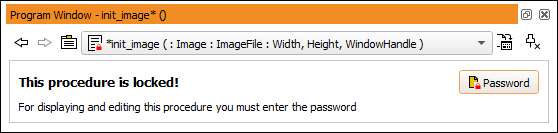 When HDevelop is started again, the protected procedure is locked. When trying to edit the procedure, for example, by selecting it from the combo box in the program window, a corresponding message is displayed in the program window see figure 6.61). Additionally, a password button is displayed in the program window. The procedure remains unlocked for this session, that is, until you close HDevelop or lock the procedure again manually.