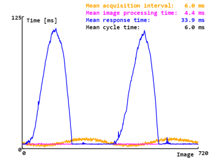图 2.8 显示了上述 HDevelop 示例程序中实施的简单流水线的运行情况。横轴上绘制的是最近 720 幅图像。橙色线表示采集间隔,即连续采集两幅图像之间的时间间隔。采集间隔会出现一些变化,具体是由图像采集函数引起的。洋红色线表示图像处理阶段所需的时间,该时间在所有图像中基本保持不变。蓝线表示响应时间,即从获取图像到完成结果评估之间的时间。