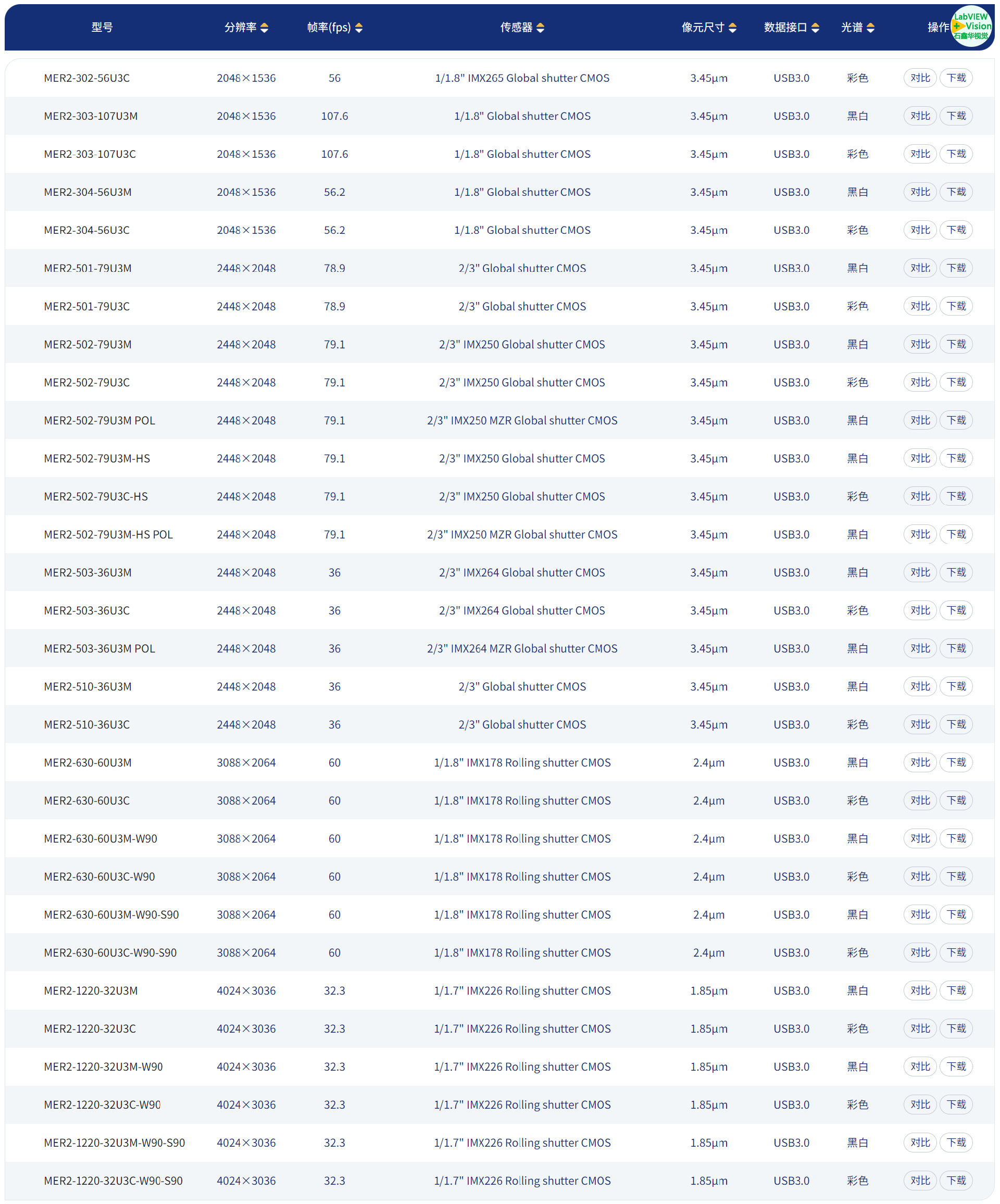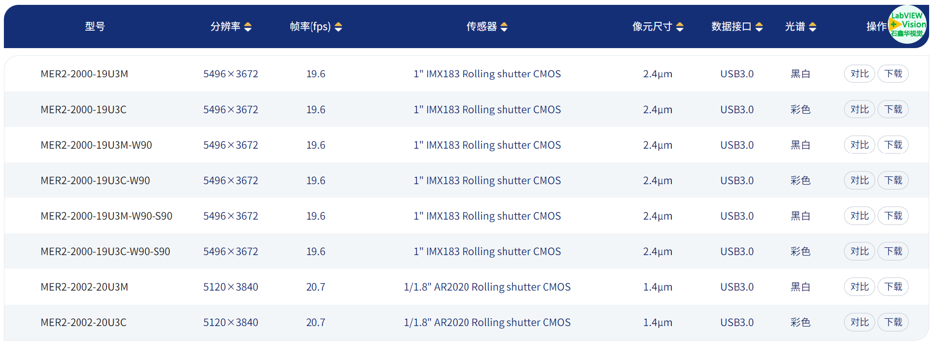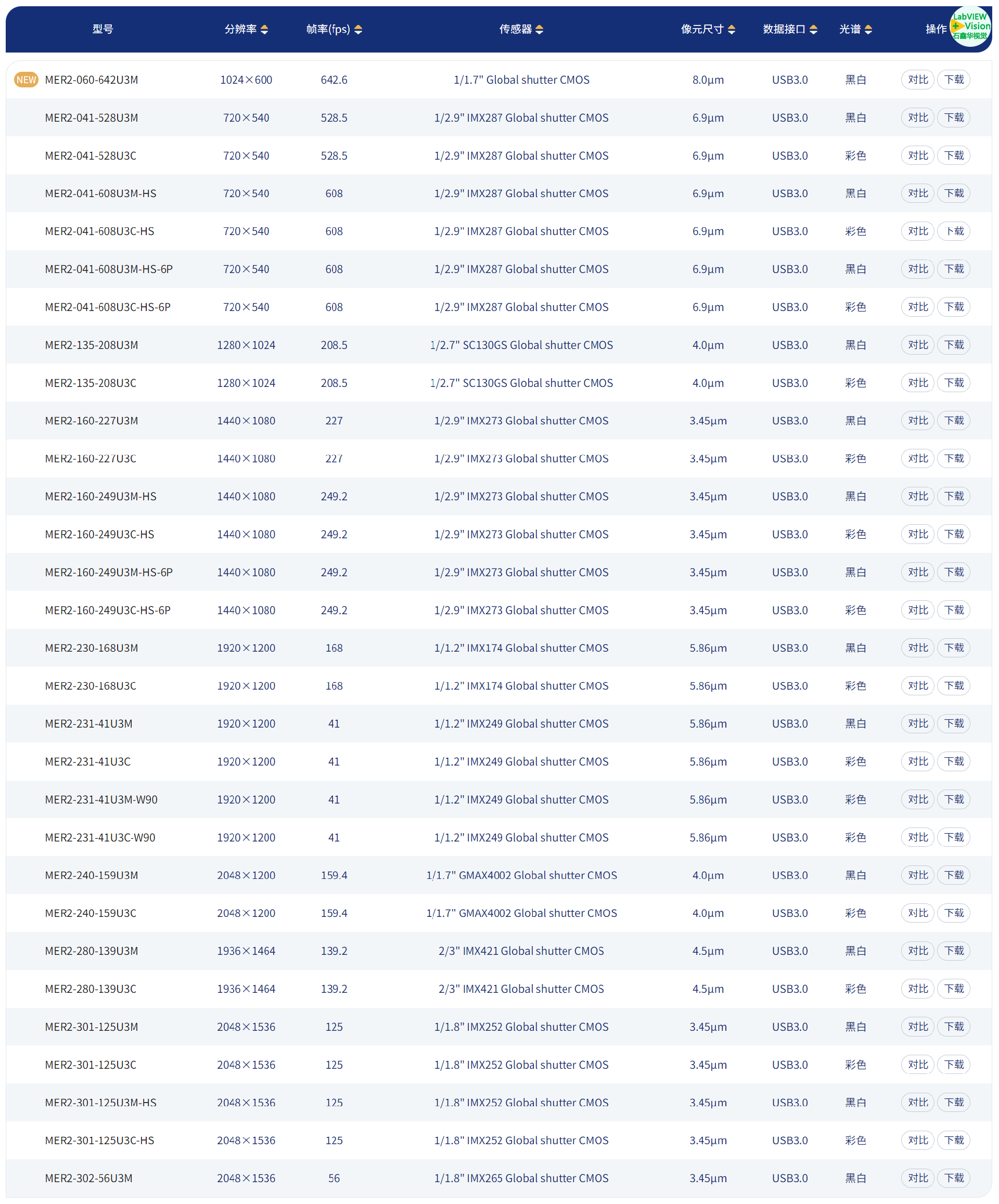 型号 | 分辨率 | 帧率(fps) | 图像传感器 | 像元尺寸 | 数据接口 | 颜色光谱 |