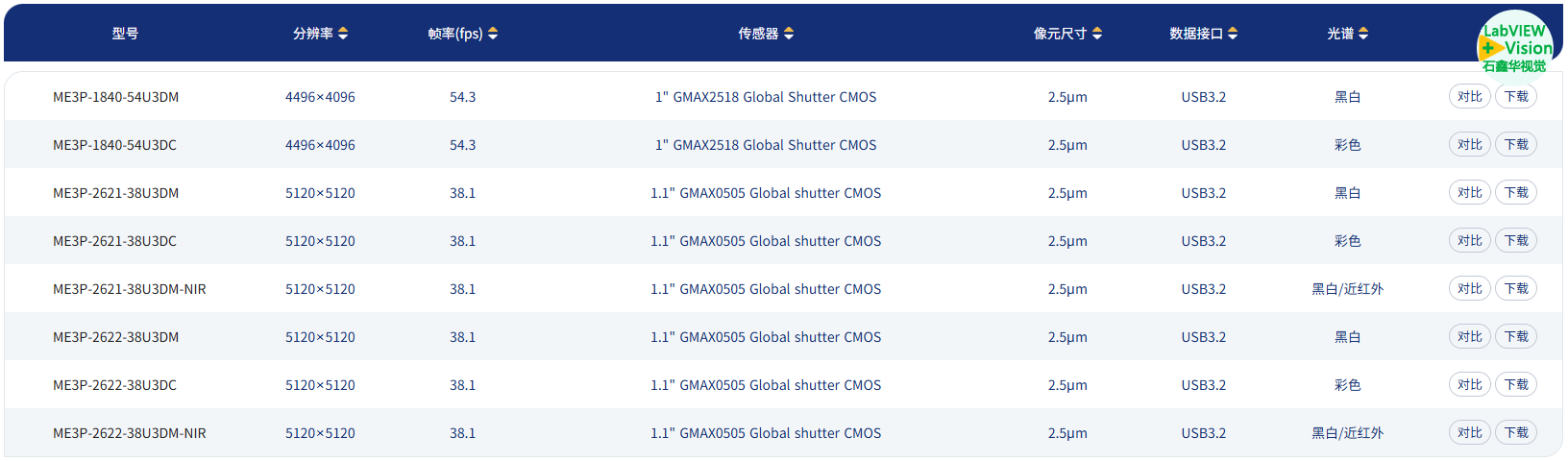 5120×5120 | 38.1 | 1.1" GMAX0505 Global shutter CMOS | 2.5μm | USB3.2 | 黑白/近红外 | |
