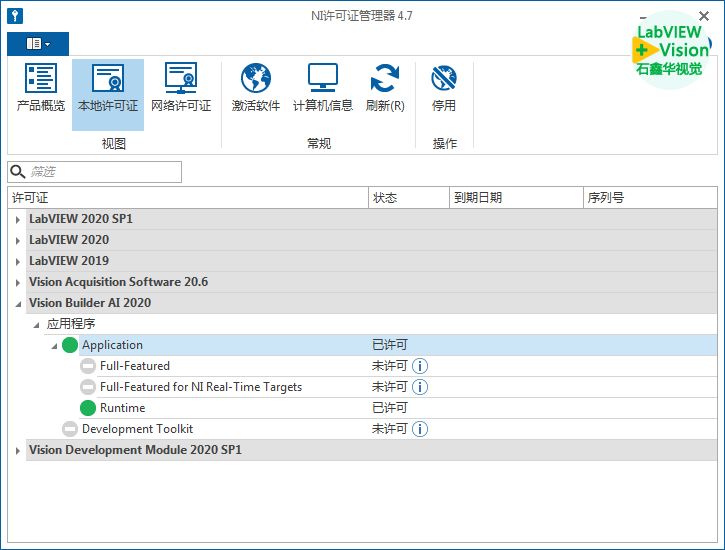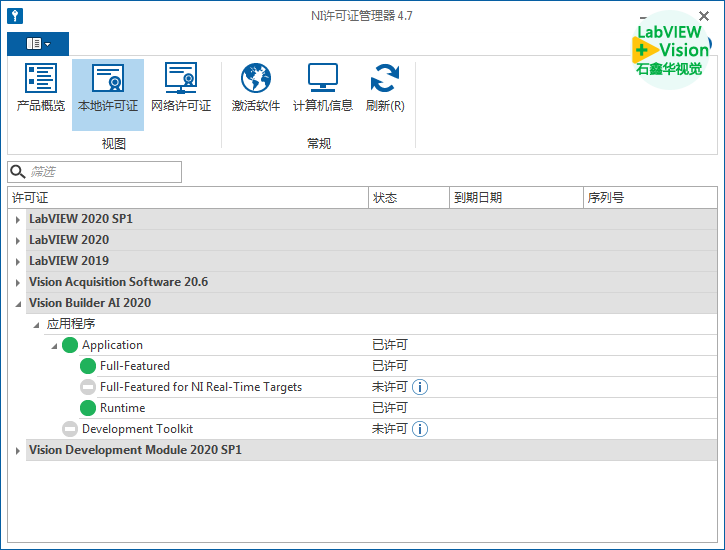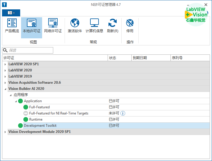 Full-Featured全功能许可证:包含了VBAI软件的所有功能。激活后,就可以使用NI的所有功能,但是不包含VBAI的开发工具包。