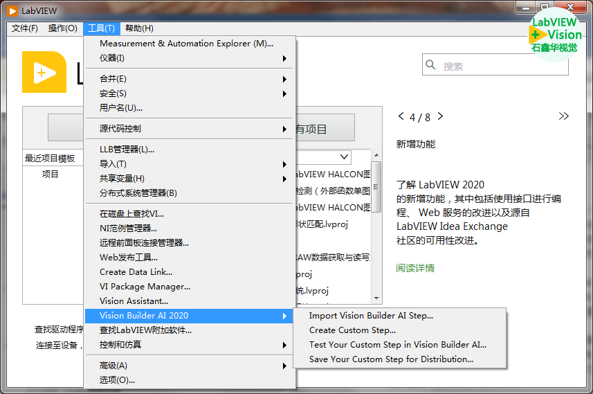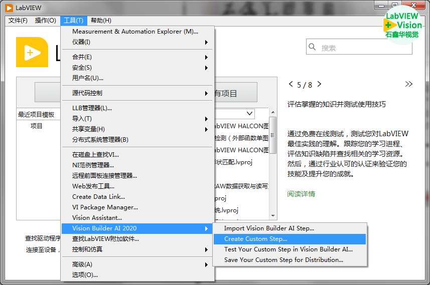这时VBAI的Development Toolkit开发工具包还是未激活状态,如果打开LabVIEW 2020,然后导航到菜单>工具>Vision Builder AI 2020>Create Custom Step(四个功能选项都需要开发工具包):