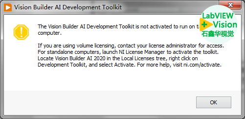 这时因为开发工具包未激活而报错,大概的意思就是当前计算机的VBAI开发工具包没有激活。如果你使用的是批量许可证,则联系你的许可证管理员激活。对于独立的计算机,运行NI许可证管理器来激活这个工具包。在本地许可证树中定位到VBAI 2020,右键选择Development Toolkit,选择激活。