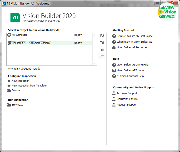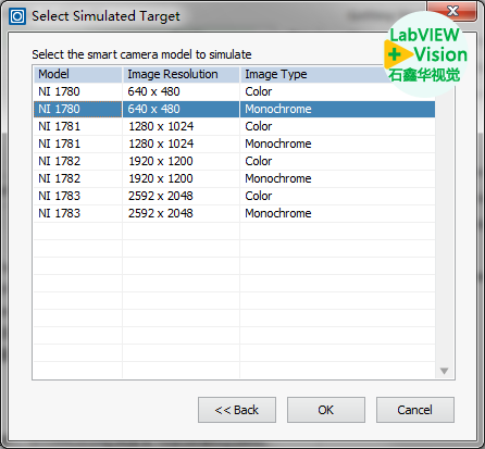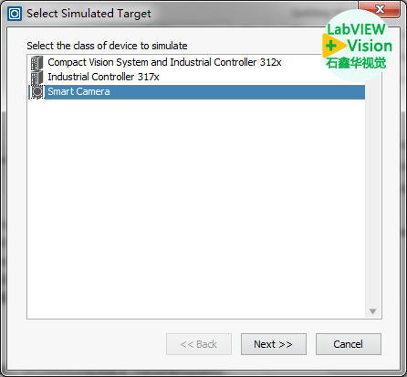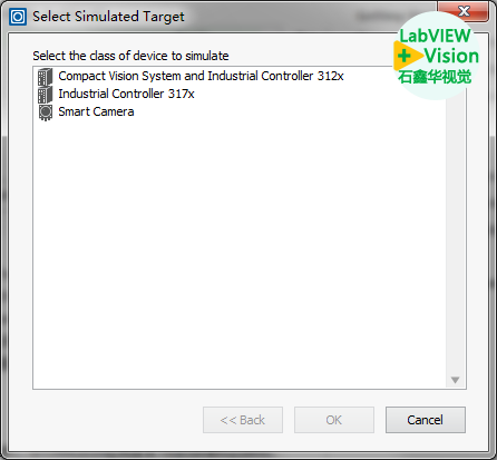 上图为选择仿真设备列表,共有三类。第一类为Compact Vision System and Industrial Controller 312x,为紧凑视觉系统和工业控制器312x系列;第二类为Inustrial Controller 317x,为工业控制器317x系列;第三类为Smart Camera,为智能相机。这三类硬件都是NI自己生产的视觉硬件产品。在这里可以使用仿真进行演示。