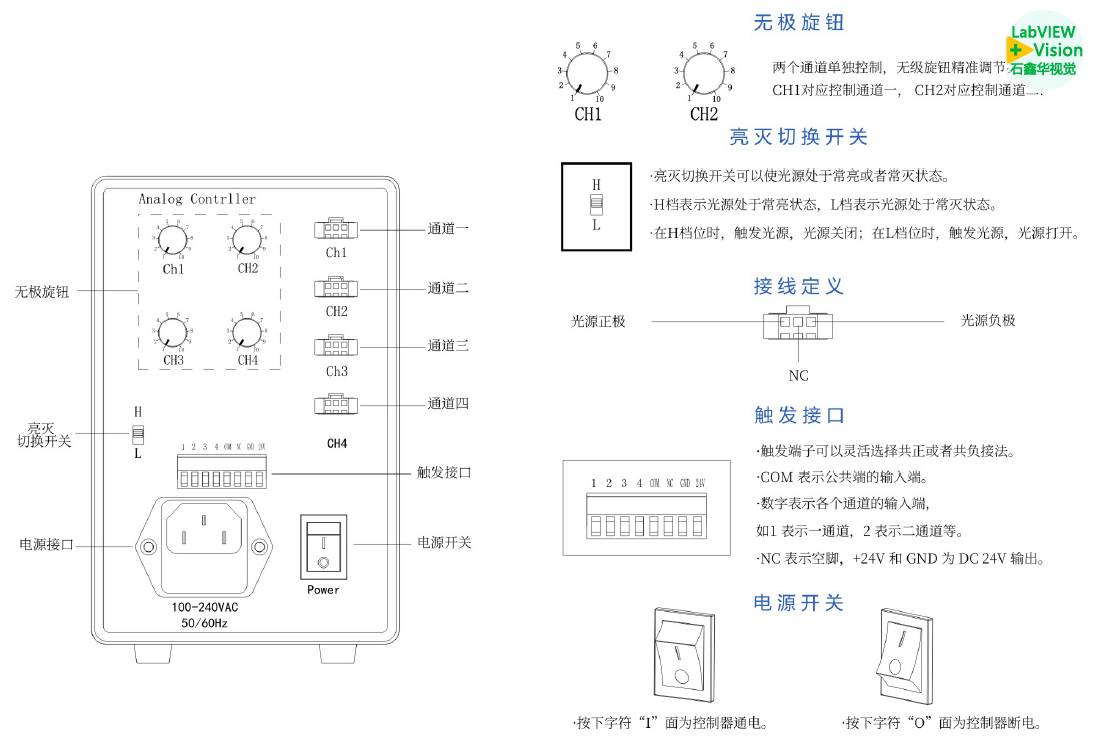 如果使用常规的环形光源、条形光源、同轴光源、圆顶光源,则一般的24V控制器就可以了。因为可能会有多个位置进行测试,可能需要多个位置进行打光,也就是需要多个光源。所以可以考虑4路的光源控制器。模拟、数字类型则没有太多考虑,均可以使用。